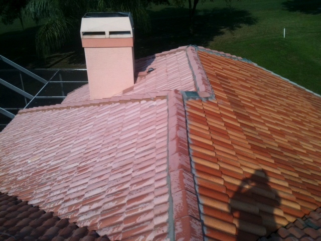 Hydro sheen tile roof glaze system above the tile roof has been cleaned with rtc 5000 roof tile cleaner hydro bonded with two coats of custom color toro perro rojo.